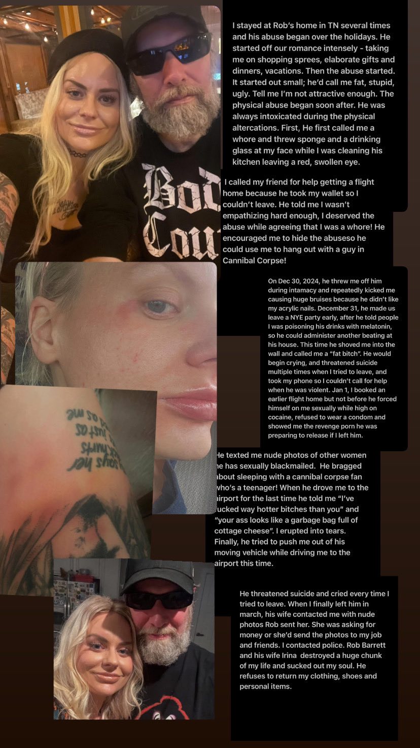 In recent days, troubling allegations have surfaced online involving Rob Barrett, guitarist of the legendary death metal band Cannibal Corpse. The accusations, originally shared via social media, come from a woman who detailed a series of abusive incidents involving both psychological and physical harm, alongside serious claims of sexual misconduct.