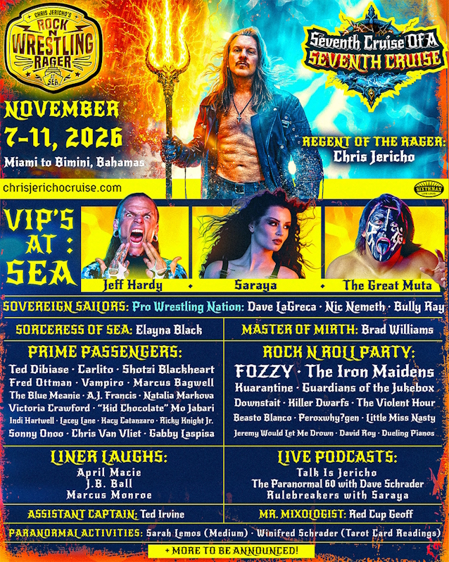 Professional wrestler, singer of FOZZY, cruise cult leader, and part-time paranormal investigator Chris Jericho is once again calling his followers to the high seas for Chris Jericho’s Rock N’ Wrestling Rager At Sea: The Seventh Cruise Of A Seventh Cruise — sailing November 7–11, 2026 from Miami to Bimini, Bahamas aboard the Norwegian Jewel.