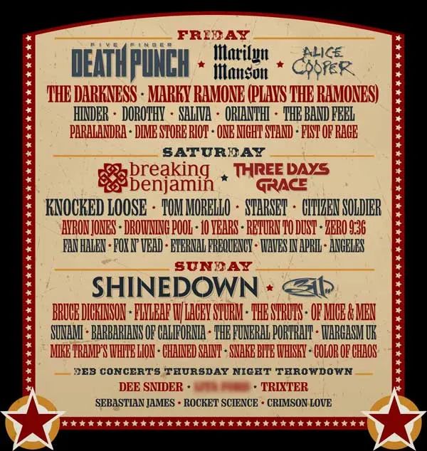 The headliners of this year’s festival will be Five Finger Death Punch, Breaking Benjamin and Shinedown. Other artists on the bill include Marilyn Manson, Three Days Grace, 311, Alice Cooper, The Darkness, Knocked Loose, Tom Morello and Bruce Dickinson.