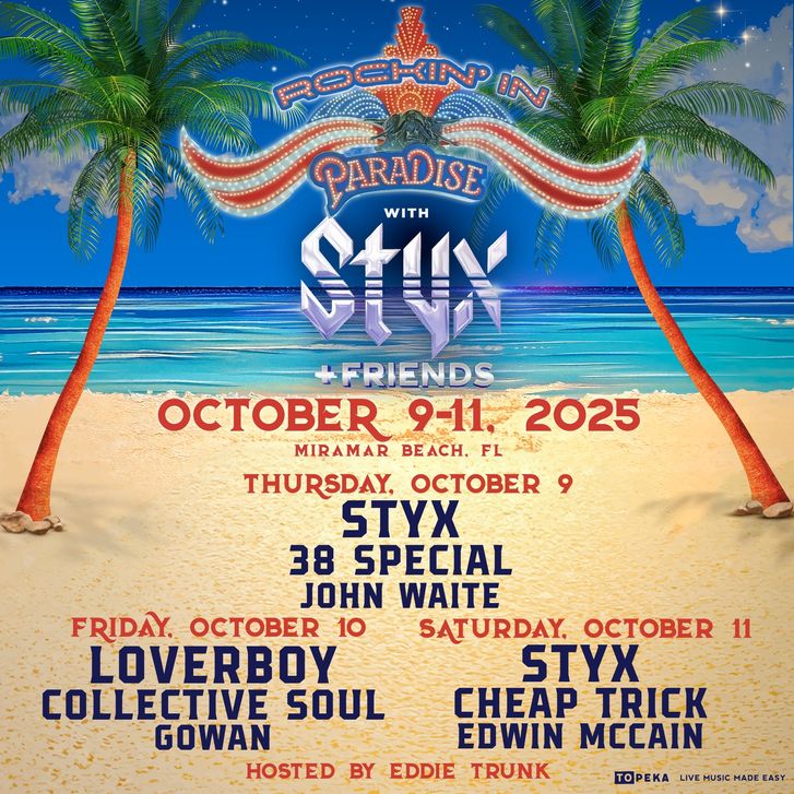 “We are so excited to bring you Rockin’ in Paradise in Miramar Beach. One of my favorite places to visit,” Styx frontman Tommy Shaw shares. “Our Friends can’t wait to join us to bring you this one-of-a-kind experience. Let’s Rock this October!”
