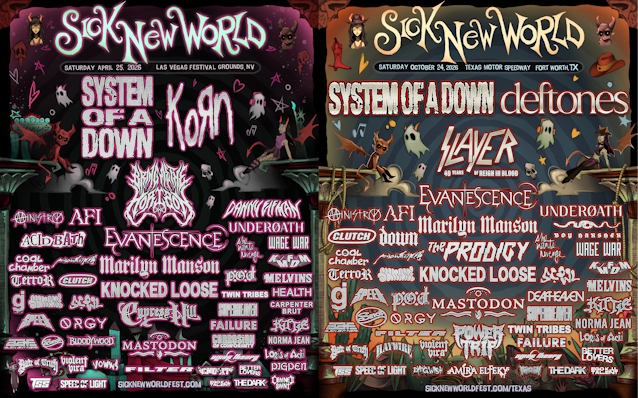 SYSTEM OF A DOWN and KORN will return to Sick New World Las Vegas, taking place at the Las Vegas Festival Grounds on April 25, 2026. The staggering lineup features additional performances from BRING ME THE HORIZON, EVANESCENCE, Marilyn Manson, Danny Elfman, KNOCKED LOOSE, MINISTRY, AFI, CYPRESS HILL, ACID BATH and many more. Fans can sign up now at SickNewWorldFest.com/Vegas for the official newsletter and SMS list to receive an access code for the presale beginning Thursday, October 23 at 10 a.m. PT. A same-day public on-sale will follow for any remaining tickets.
